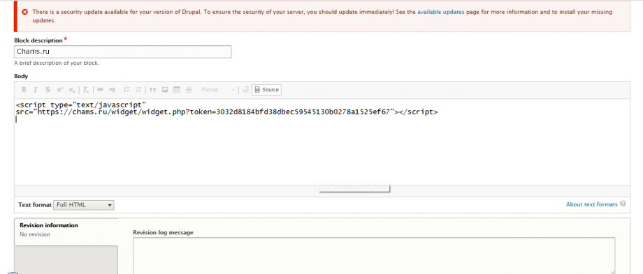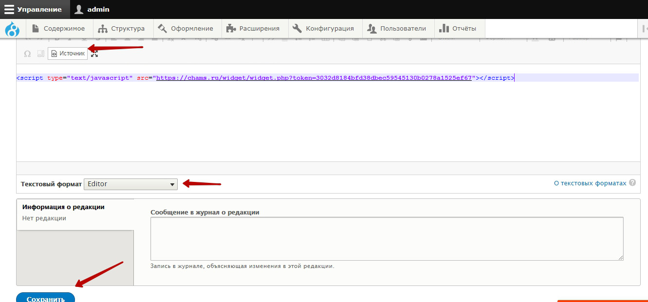 Если, редактор конструктора заменяет специальные символы, и отображение кода виджета в блоке выглядит некорректным, то в формате текста выбираем Editor — Источник(вместо Full HTML)