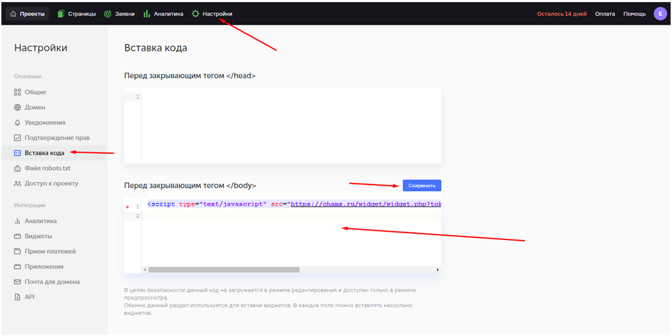 Необходимо авторизоваться в Flexbe, затем открыть раздел «Настройки», в боковом меню перейти на страницу «Вставка кода», вставить код нашего сервиса в поле «Перед закрывающим тегом </body>» и нажать «Сохранить